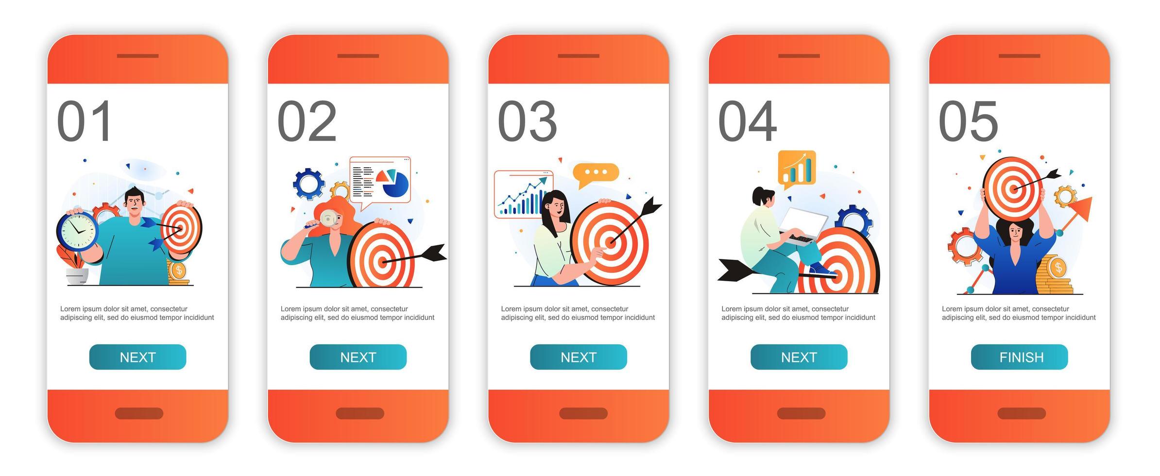 Business target concept onboarding screens for mobile app templates. Targeting, marketing success. Modern UI, UX, GUI screens user interface kit with people scenes for web design. Vector illustration Pro Vector