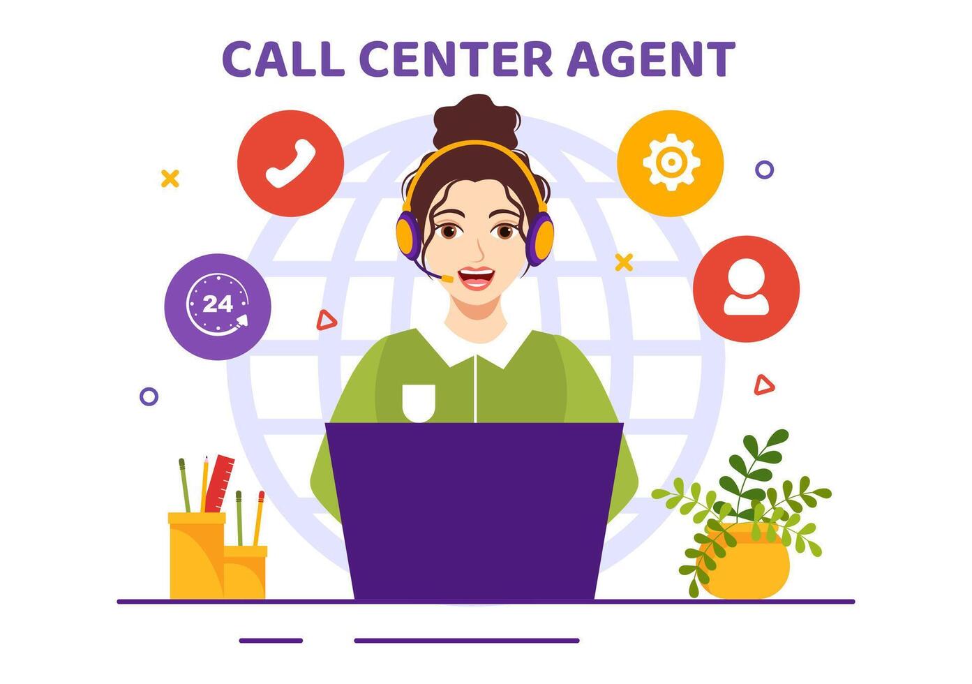 Call Center Agent Vector Illustration of Customer Service or Hotline Operator with Headsets and Computers in Flat Cartoon Background Pro Vector