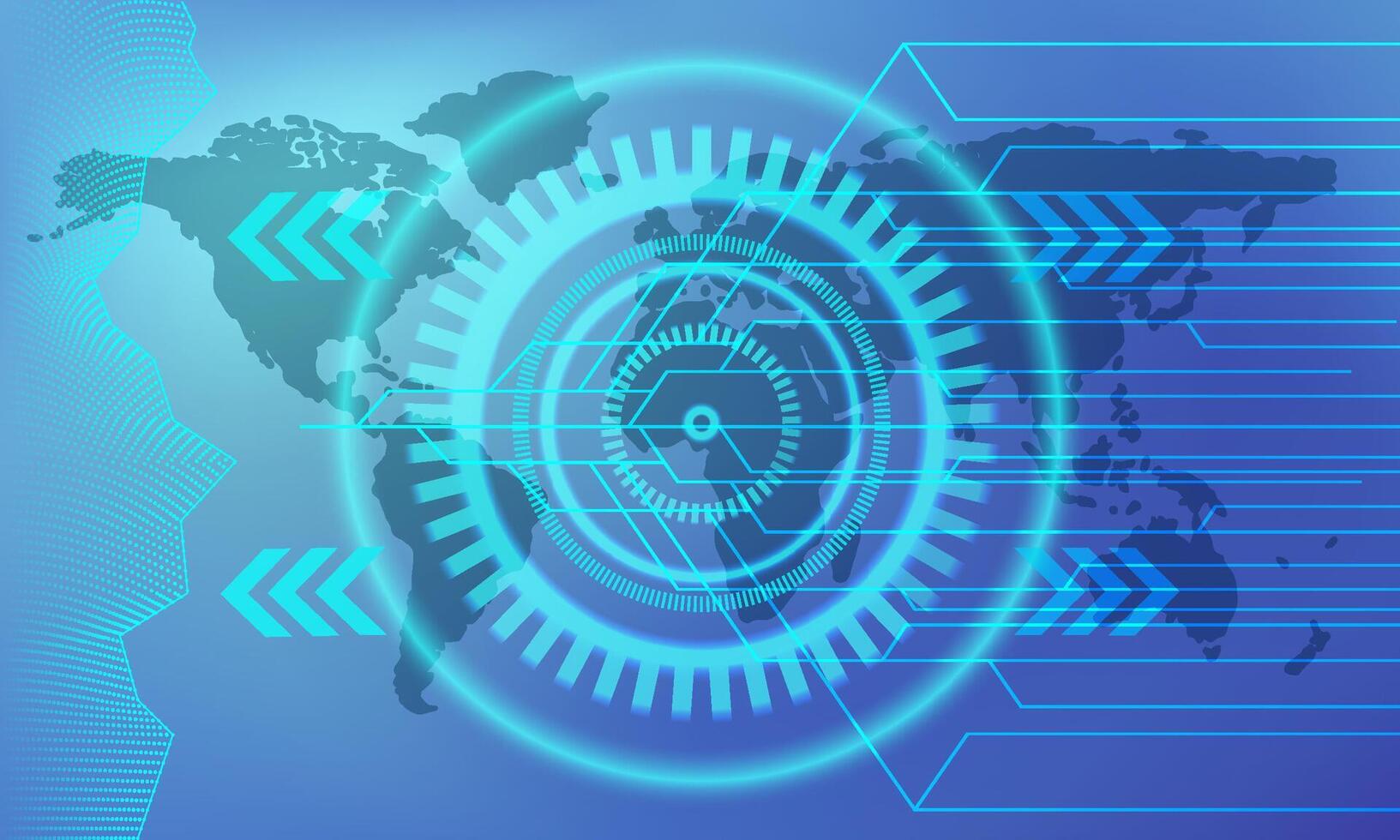 Abstract technology concept bright blue web banner. Vector template with circuit board, gear and world map Pro Vector