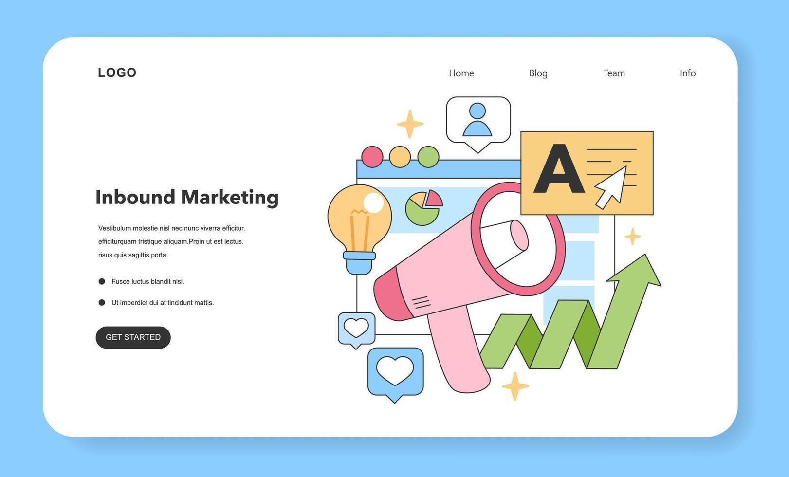 Dynamic representation of inbound marketing strategies, showcasing megaphone, growth graph, and user engagement icons. Flat vector illustration Pro Vector