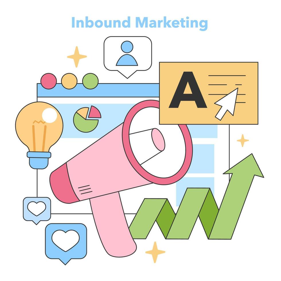 Dynamic representation of inbound marketing strategies, showcasing megaphone, growth graph, and user engagement icons. Flat vector illustration Pro Vector
