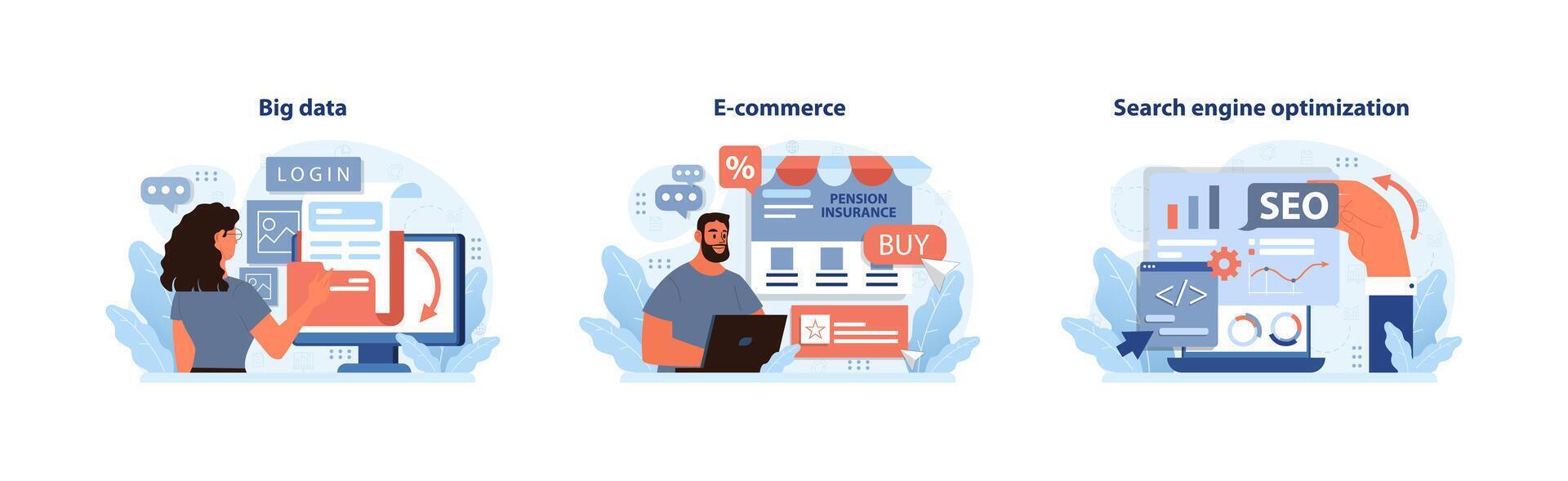 Digital Business essentials. Harnessing big data, streamlining e-commerce, and mastering SEO. Pro Vector