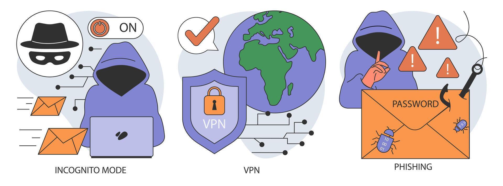 Data privacy set. Cyber or web security . Database safety of a digital device Pro Vector