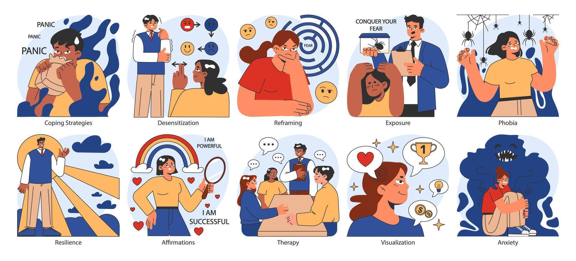 Overcoming fears set. Characters confronting fears with desensitization Pro Vector
