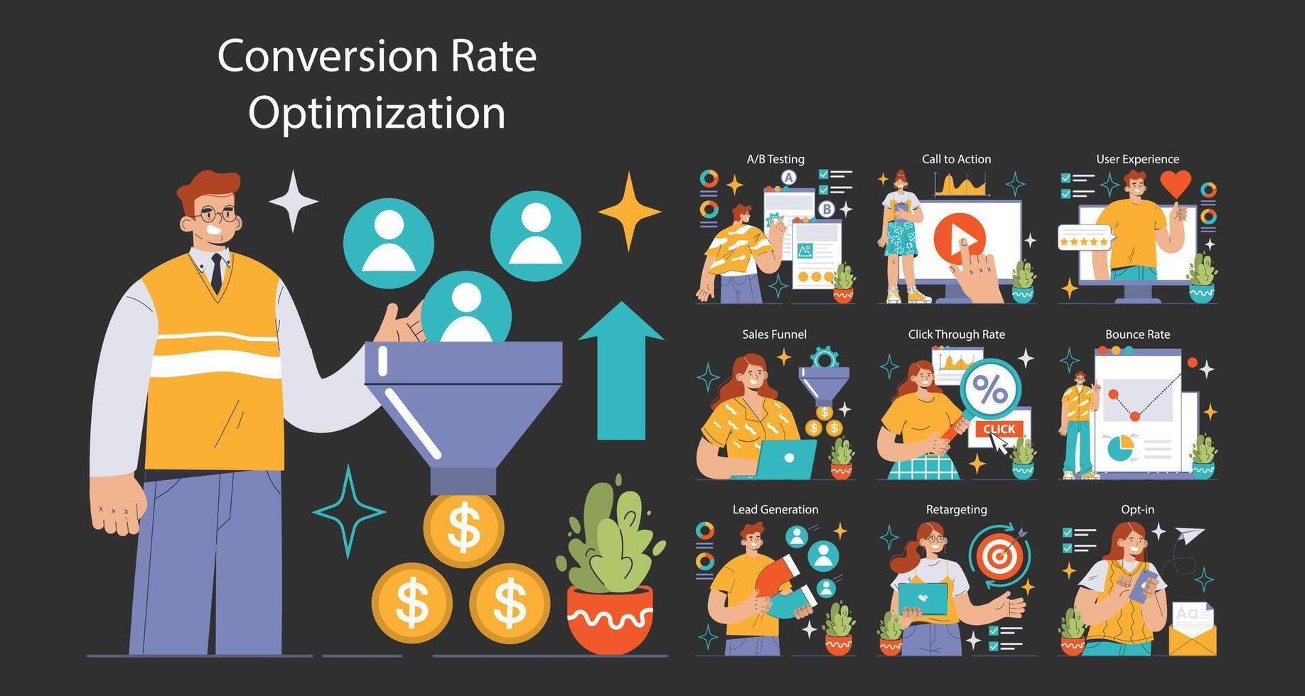 Conversion Rate Optimization set. Experts analyzing website Pro Vector