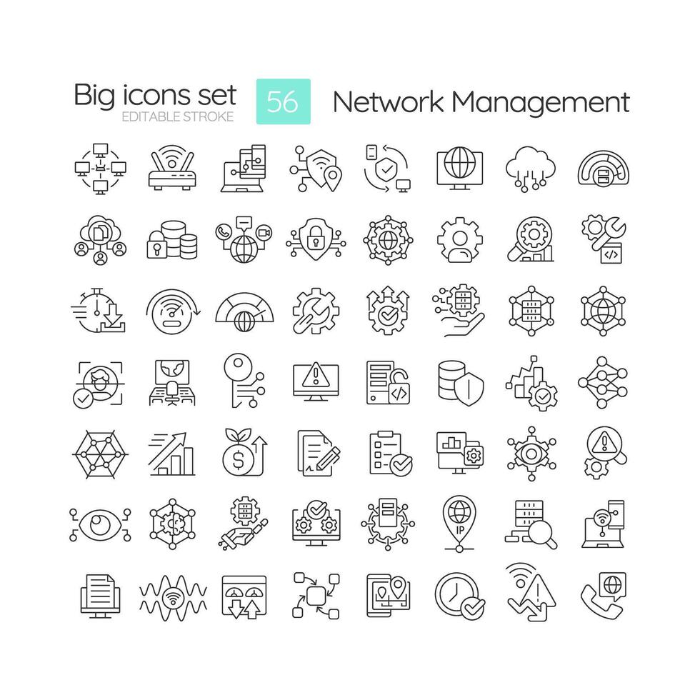 Network management linear icons set. System architecture, digital administration. Performance monitoring. Customizable thin line symbols. Isolated vector outline illustrations. Editable stroke Pro Vector