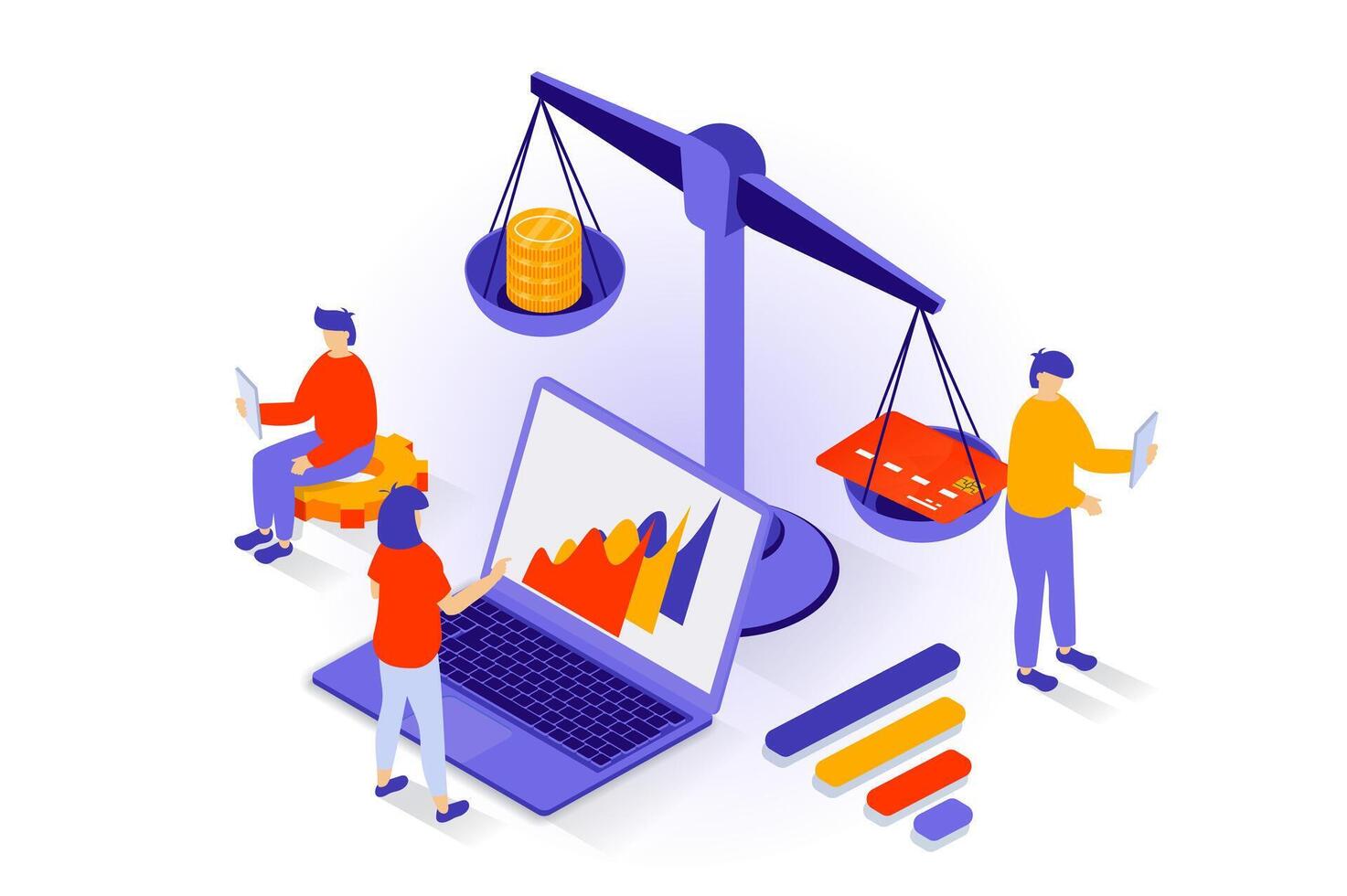 Business and marketing concept in 3d isometric design. People working in e-commerce, developing company, accounting and creating ad campaign. Vector illustration with isometry scene for web graphic Pro Vector