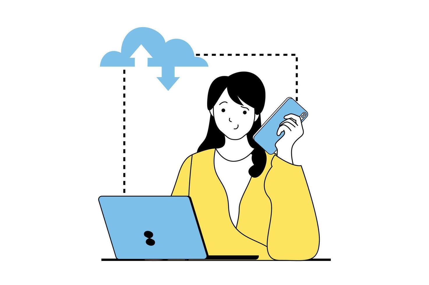 Cloud computing concept with people scene in flat web design. Woman sync her data files and making optimization with different devices. Vector illustration for social media banner, marketing material. Pro Vector