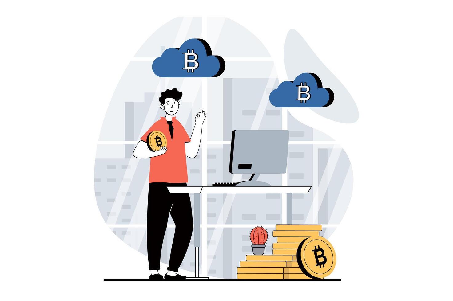 Cryptocurrency mining concept with people scene in flat design for web. Man mining bitcoins, using cloud computing at data center. Vector illustration for social media banner, marketing material. Pro Vector