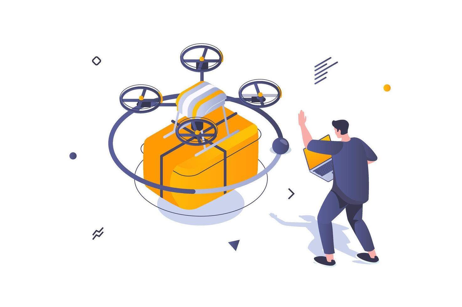 Food delivery concept in 3d isometric design. Man using flying drone for express shipping of meal box from ordering restaurant menu. Vector illustration with isometric people scene for web graphic Pro Vector