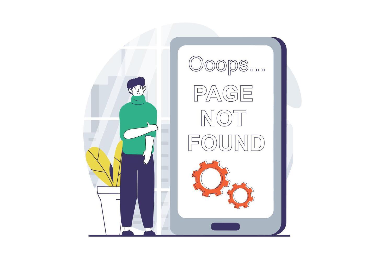 Page not found concept with people scene in flat design for web. Man sees message of website connection problems on mobile screen. Vector illustration for social media banner, marketing material. Pro Vector