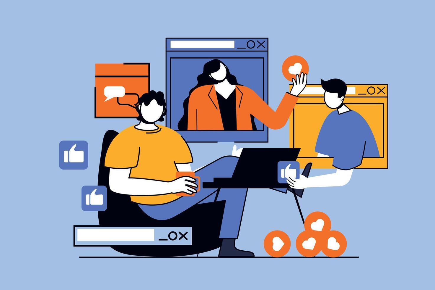 Video chatting concept with people scene in flat design for web. Man and woman connecting and talking online using computer program. Vector illustration for social media banner, marketing material. Pro Vector