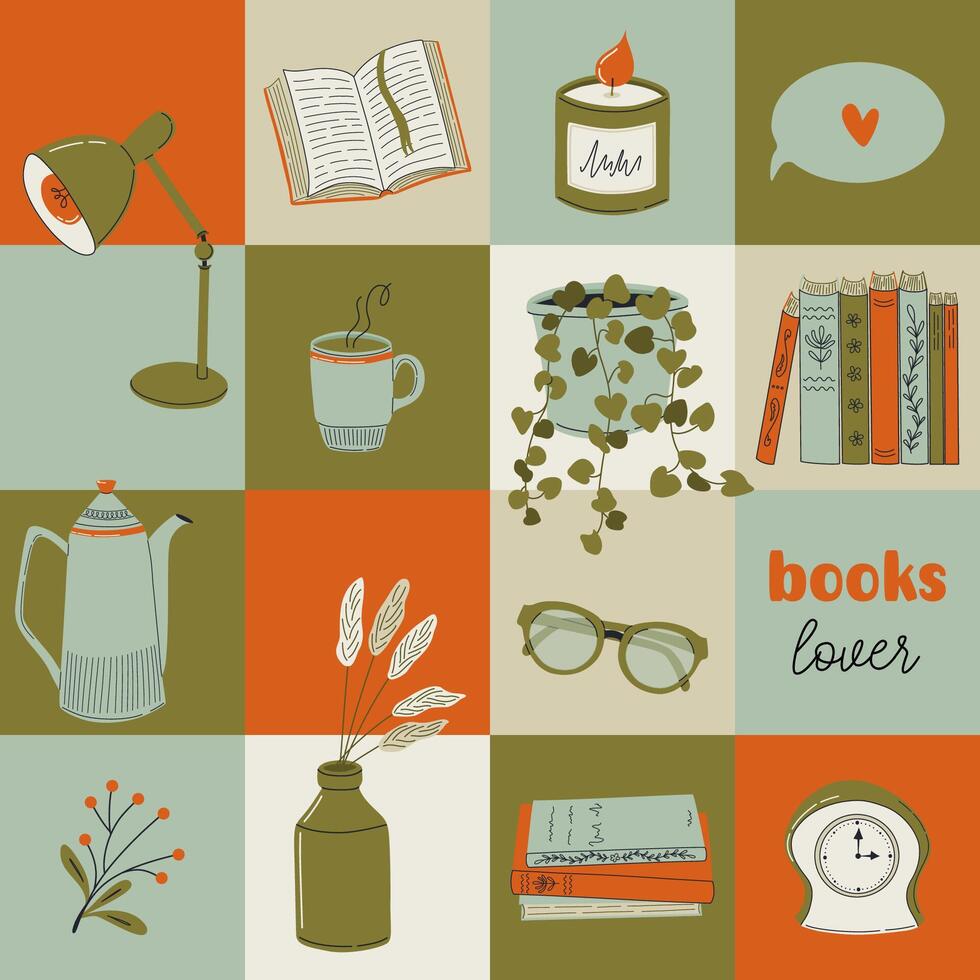 Abstract geometric seamless pattern with books and cozy home elements. Mosaic background with domestic life objects. Retro design vector illustration, flat style. Pro Vector