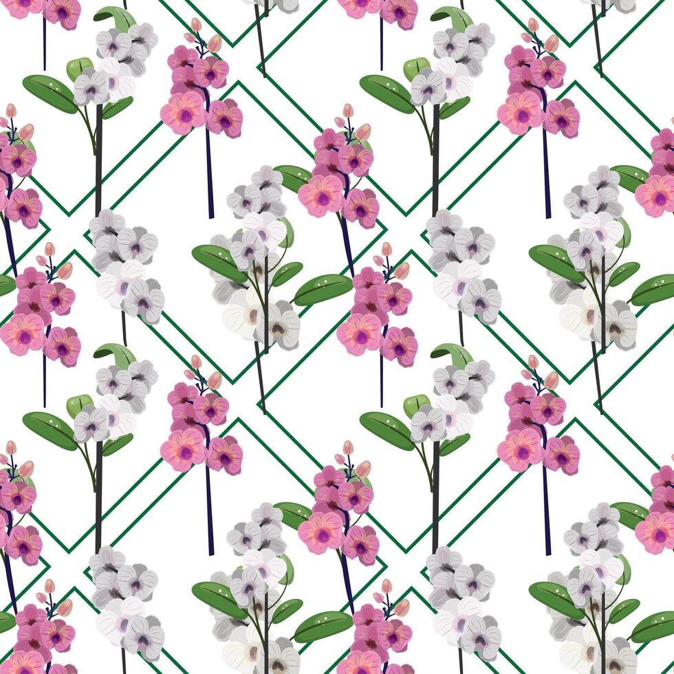 Seamless pattern with orchids on the stem and decorative outline diamond shape son the background Pro Vector