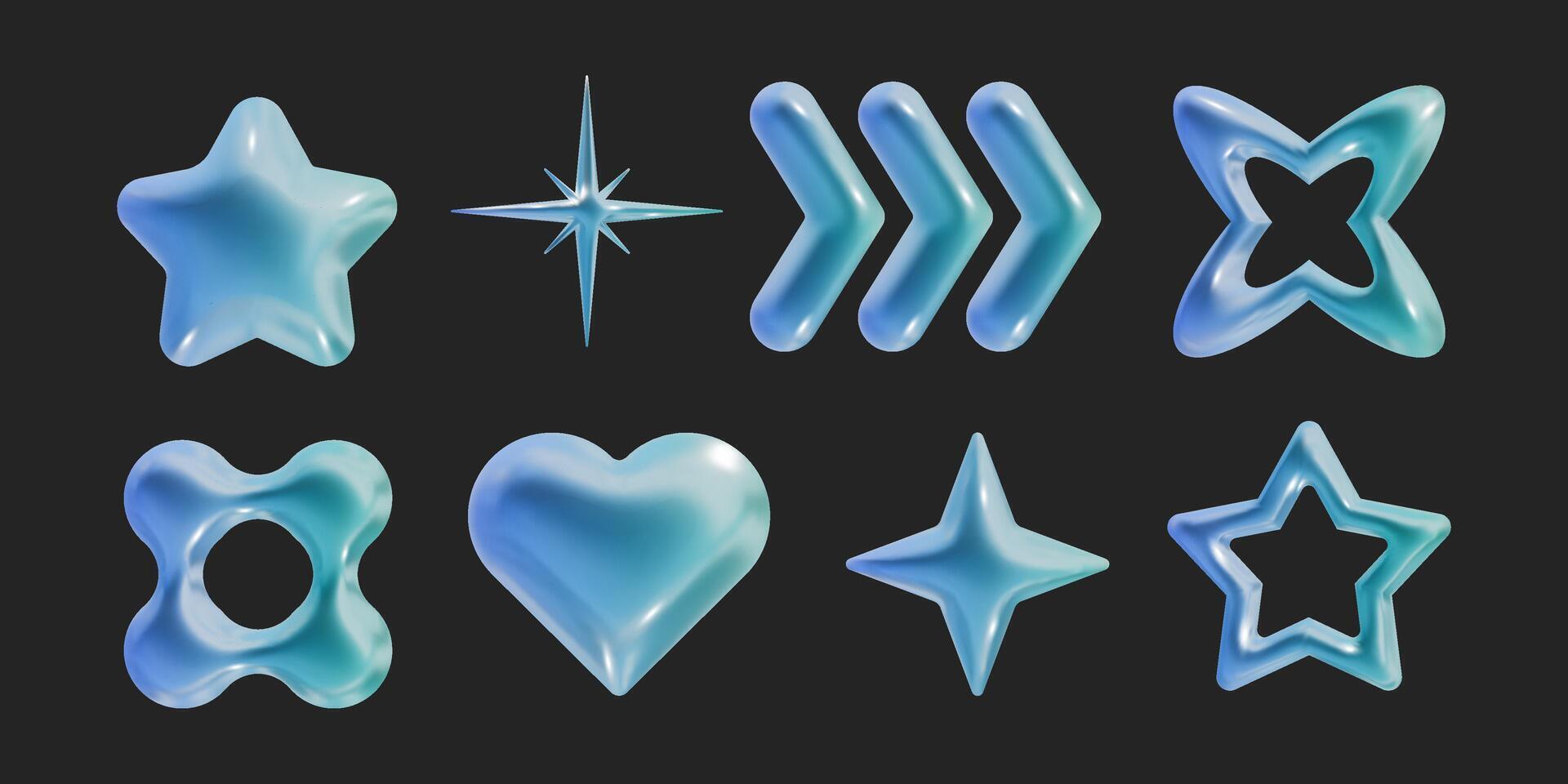 Set of Y2k vector geometric 3D render chrome shapes trendy retro futuristic design elements, infographic shapes. Modern concept with symbols and objects, star, heart illustration for UI and UX. Pro Vector