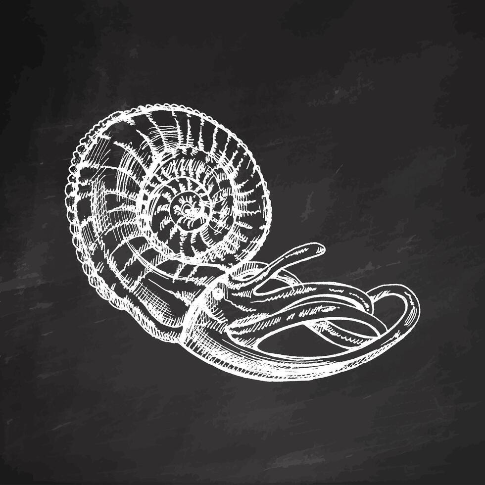 Hand-drawn sketch of nautilus mollusc in a shell, clam, conch. Scallop sea shell, sketch style vector illustration isolated on chalkboard background. Pro Vector