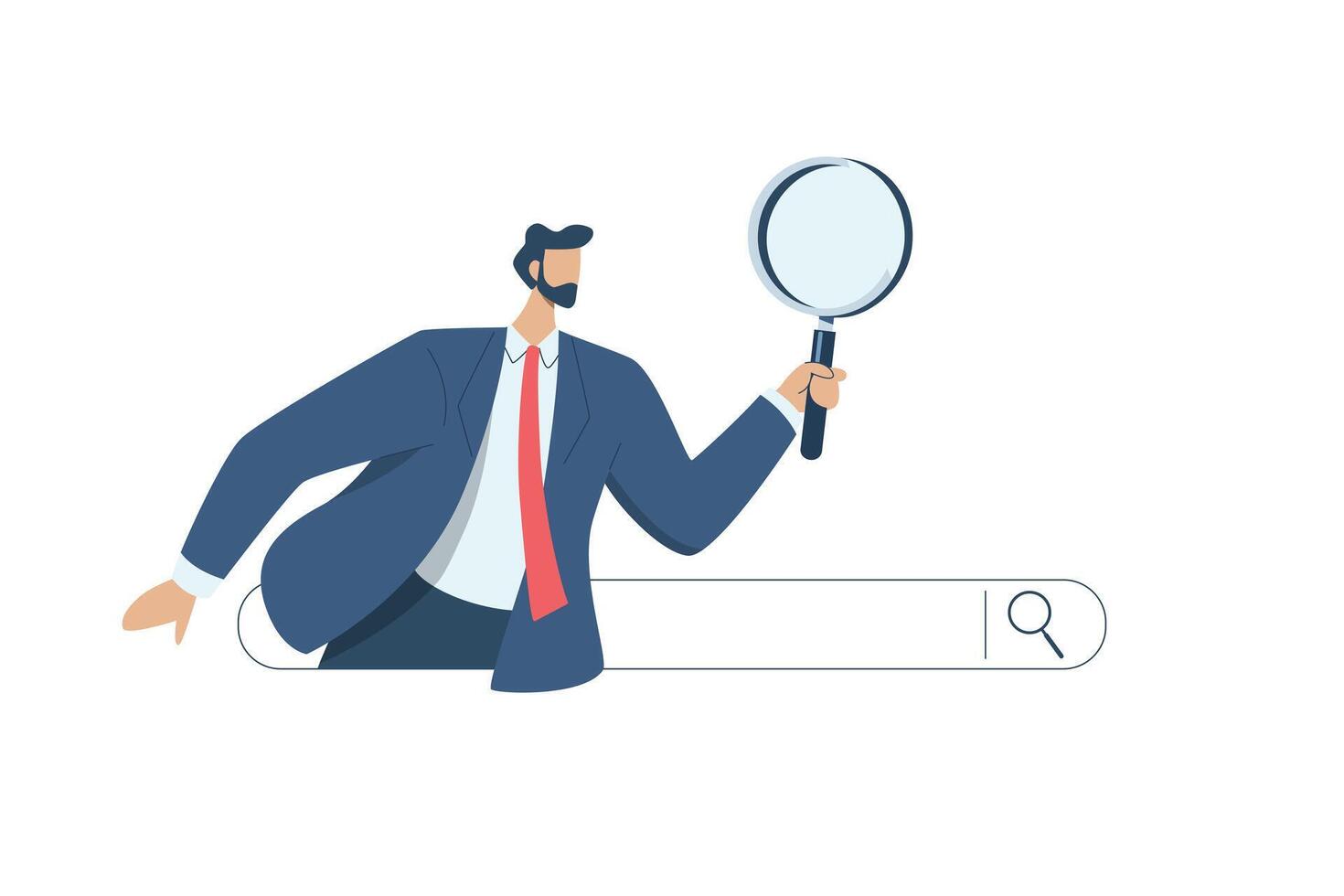 SEO. Search engine optimization, Analyze website page statistics, Internet marketing concepts, Man with magnifying glass coming out of web browser bar. Searching for information online. Pro Vector