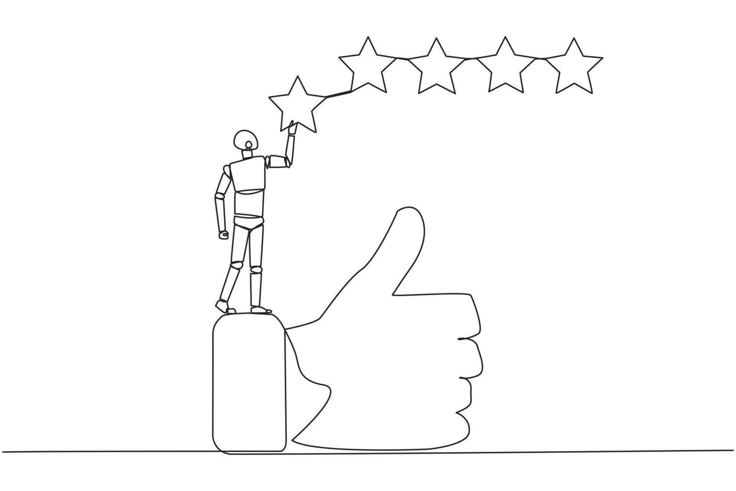 Single continuous line drawing robot standing on the thumbs up wants to attach the stars to form 5 stars in a row. Give review or good feedback. Artificial intelligence. One line vector illustration Pro Vector