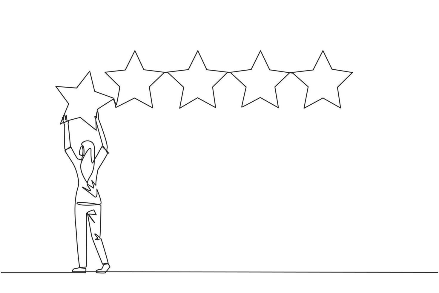 Continuous one line drawing woman stood holding up a star with both hands and pasting it up to make 5 stars in a row. Give the best review. Online shop. Single line draw design vector illustration Pro Vector
