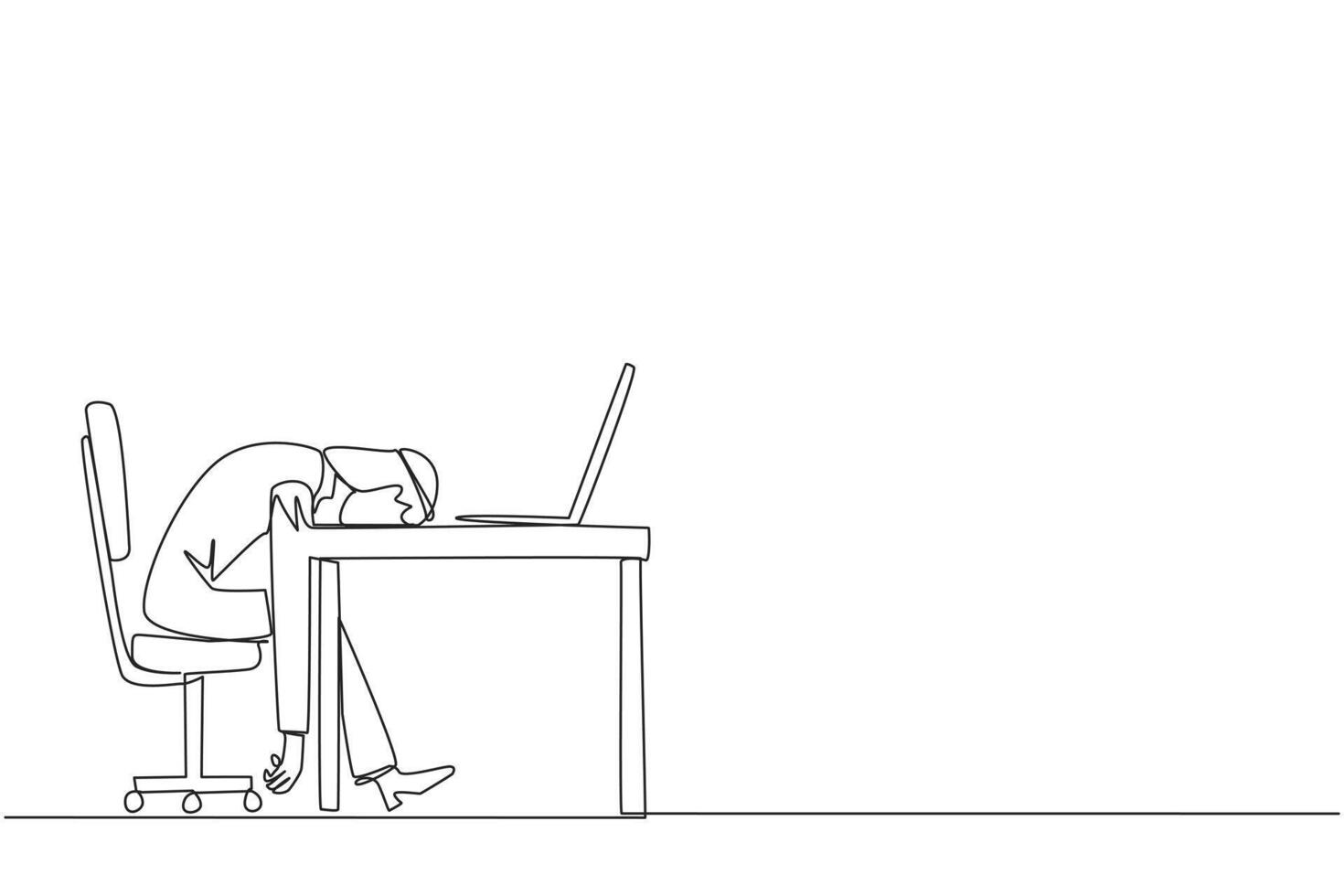 Single continuous line drawing Arabian businessman fell asleep in front of a laptop computer. Fatigue running a business. Mental health problem. Exhausted. Bored. One line design vector illustration Pro Vector