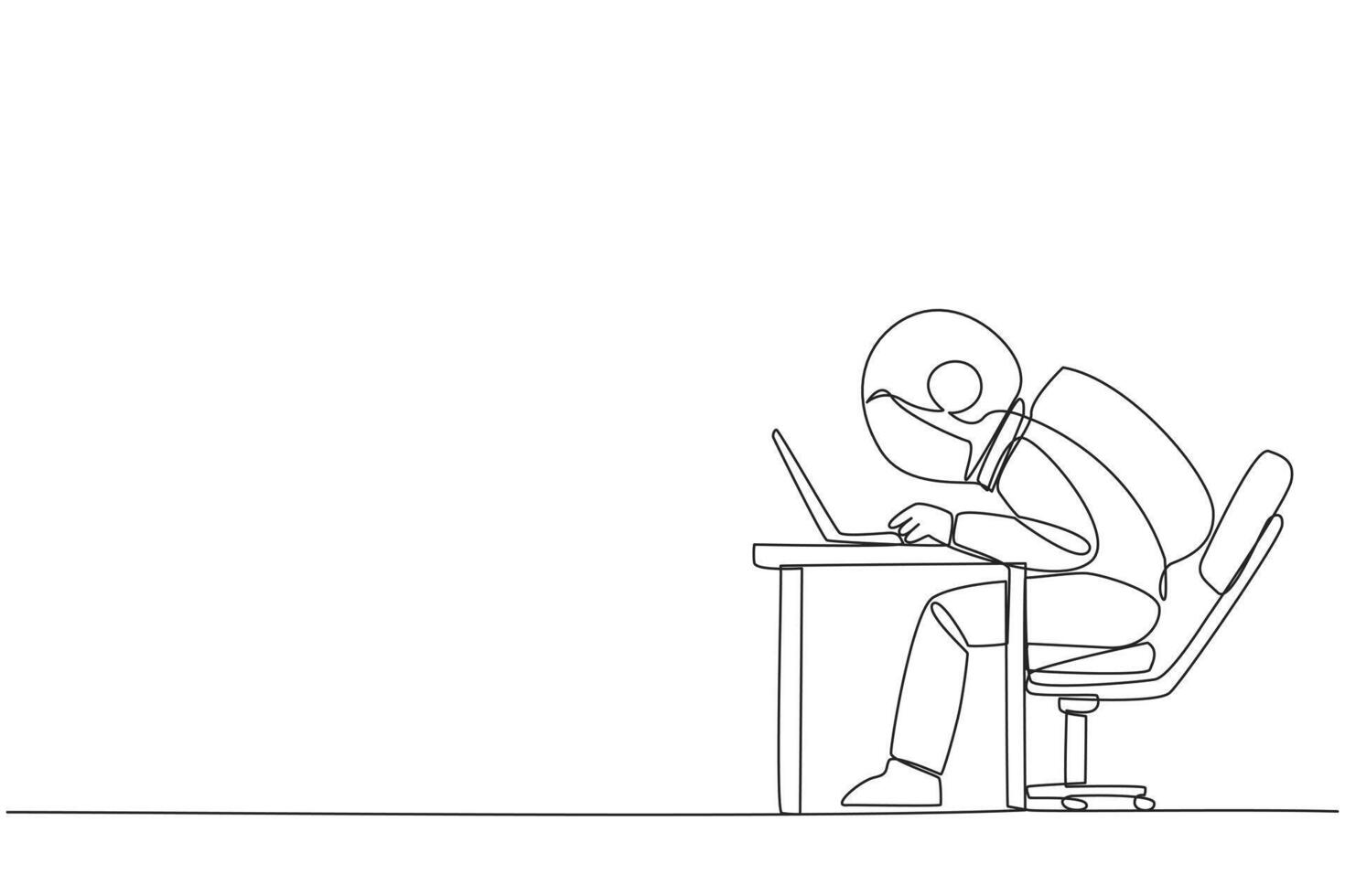 Single one line drawing astronaut sitting and typing on laptop computer. Work hard to achieve maximum expected results. Overtime and work smart. Spaceman. Continuous line design graphic illustration Pro Vector