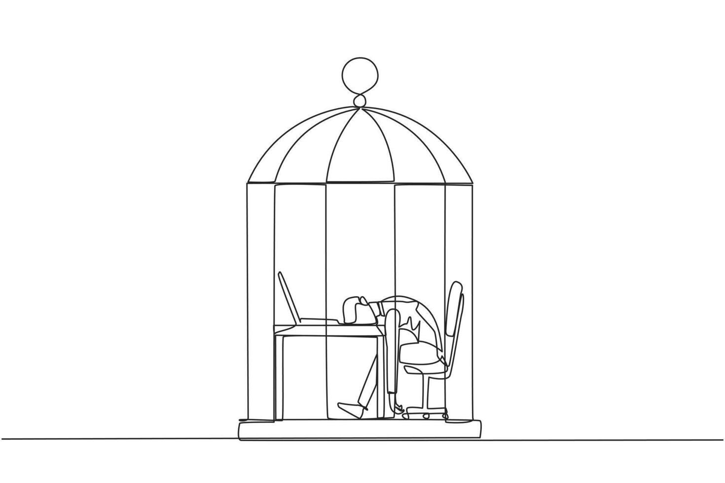 Single continuous line drawing businessman trapped in cage asleep on laptop computer. Tired of repetitive routines. The many deadlines require overtime every day. One line design vector illustration Pro Vector