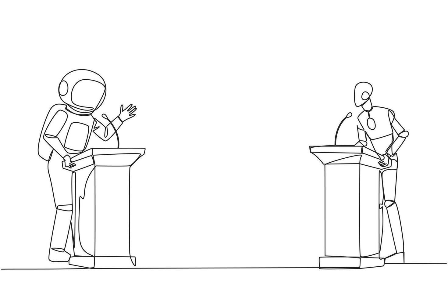 Single continuous line drawing robotic and astronaut arguing on the podium. Throwing arguments at each other, not wanting to give in. Feel most right. Debate. One line design vector illustration Pro Vector