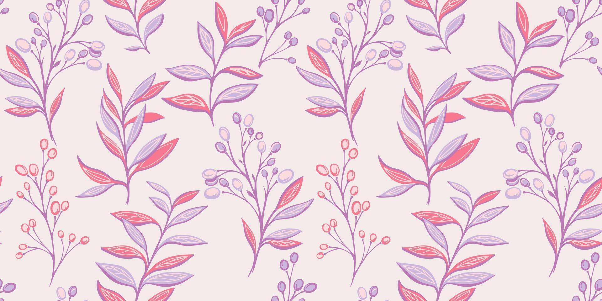 Pastel gently seamless pattern with abstract leaves, branches with shapes berries, drops, spots, dots. Vector hand drawn sketch. Creative botanical printing. Collage for designs, patterned, fabric