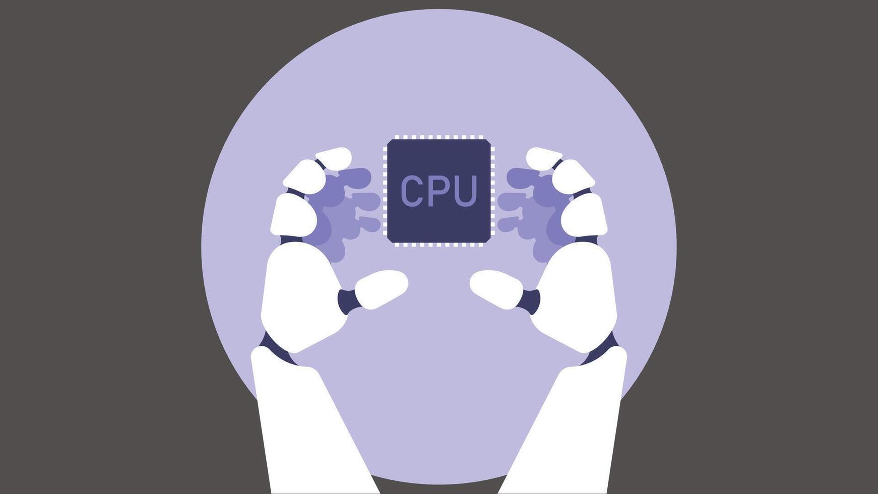 AI robot hands holding a CPU components of a super computer vector illustration Pro Vector
