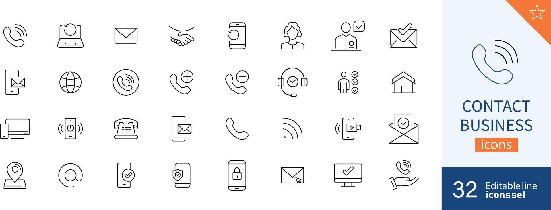 Set of 32 Contact Business web icons in line style. Connection, touching, phone, outline, symbol. Vector illustration. Free Vector