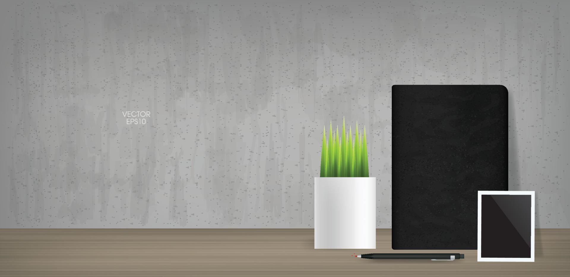 Background of notebook with office object set in working space area. Vector. Pro Vector