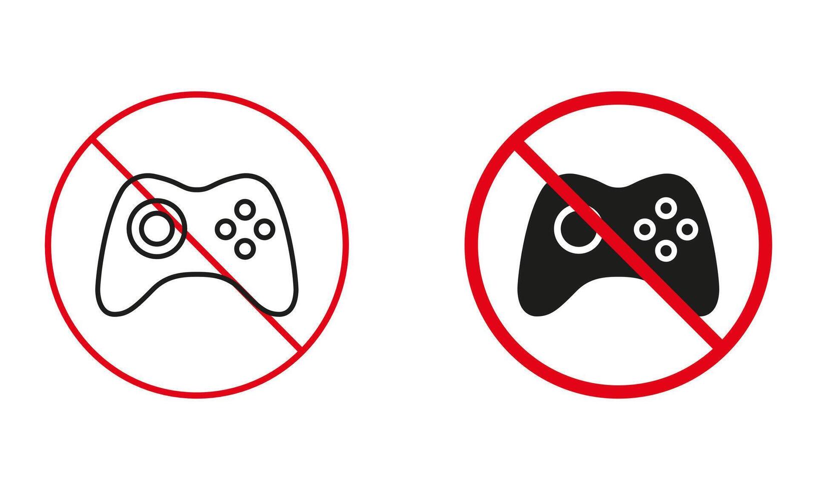 Game Pad Console Line and Silhouette Icons. Gamepad Control Not Allowed, Ban Joystick Warning Sign Set. Video Game Forbidden Zone Symbol. Isolated Vector Illustration Pro Vector