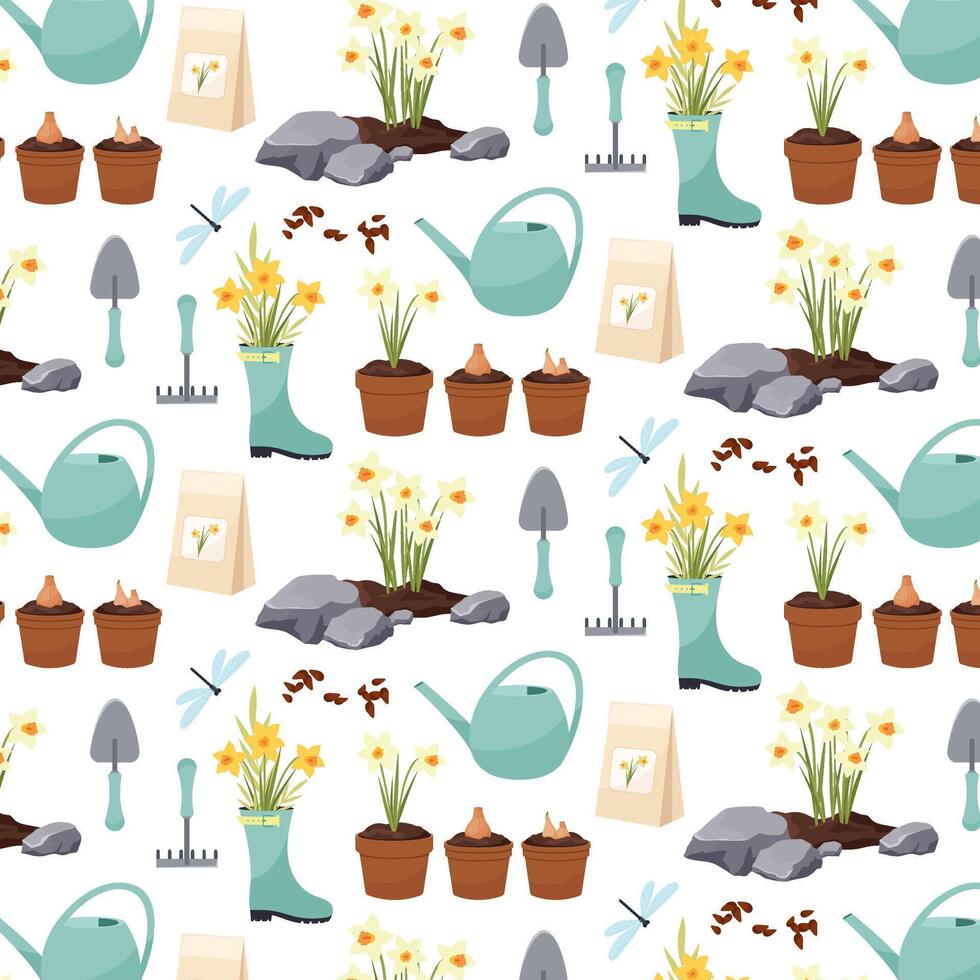 Seamless pattern with garden elements. Spring pattern on a transparent background. Flat style pattern for textile, paper or packaging. Daffodils bouquet, watering can, flower bed, seeds in flat style. Pro Vector