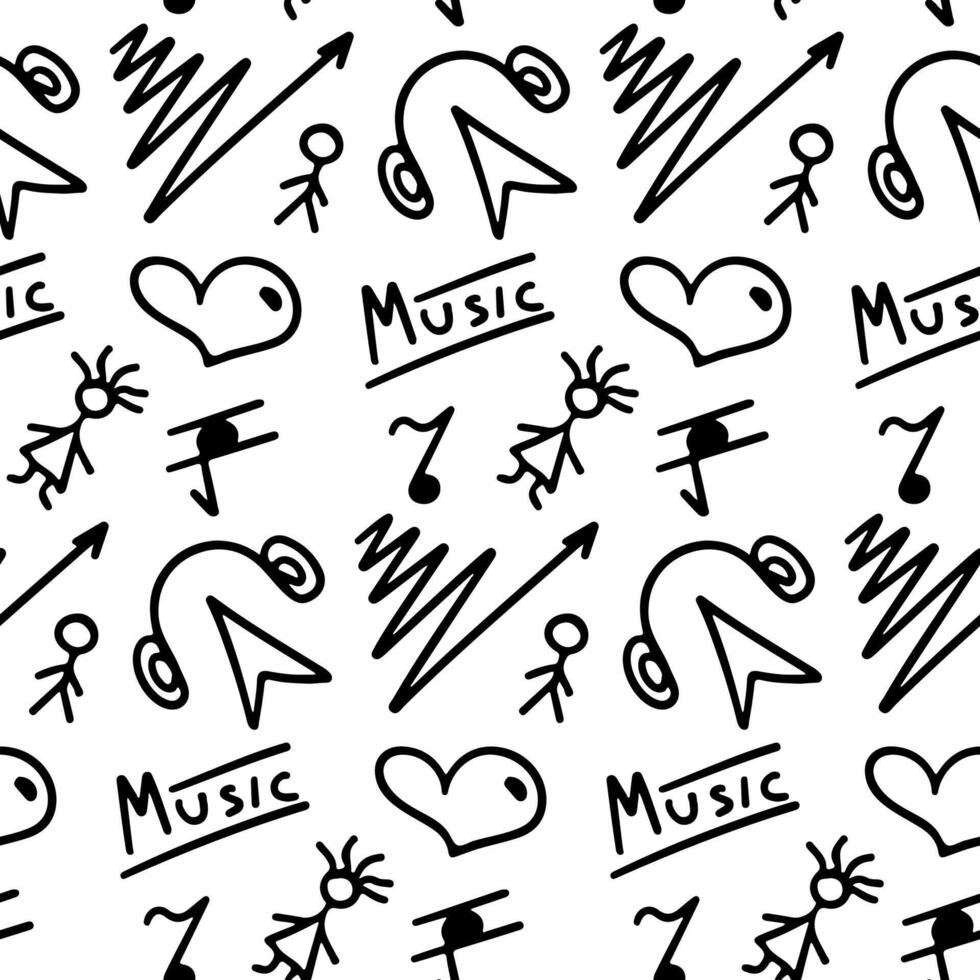 Vector seamless pattern with different simple hand drawn doodles. Hearts, arrows, sparkles, lightnings, music note, signs, and symbols. Perfect for apparel and texture Pro Vector