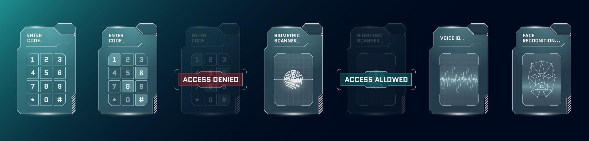 HUD biometric id set. Digital user recognition GUI or FUI interface. Person security verification PIN code entry panel. Human identity scanner and number touching dashboard. Vector protection screen Pro Vector