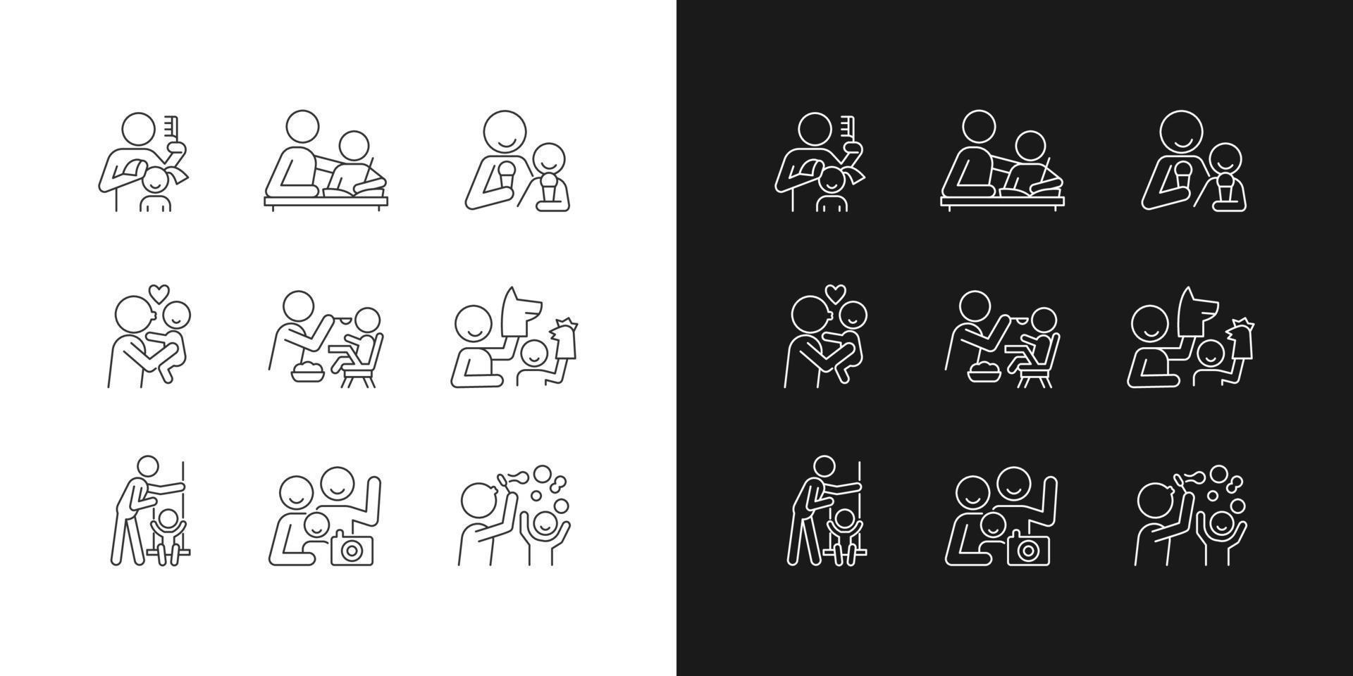 Bonding activity linear icons set for dark and light mode. Braiding pigtails. Help with homework. Kissing child. Customizable thin line symbols. Isolated vector outline illustrations. Editable stroke Pro Vector