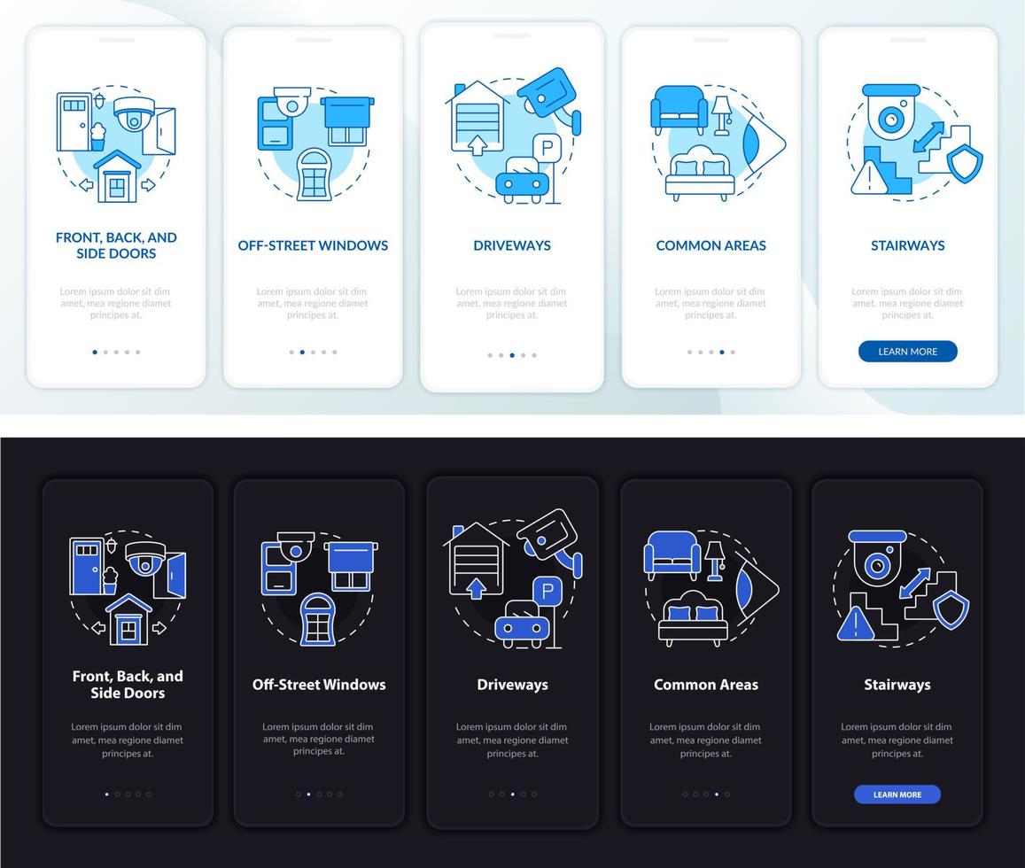 Security camera system installing onboarding mobile app page screen. Walkthrough 5 steps graphic instructions with concepts. UI, UX, GUI vector template with linear night and day mode illustrations Pro Vector
