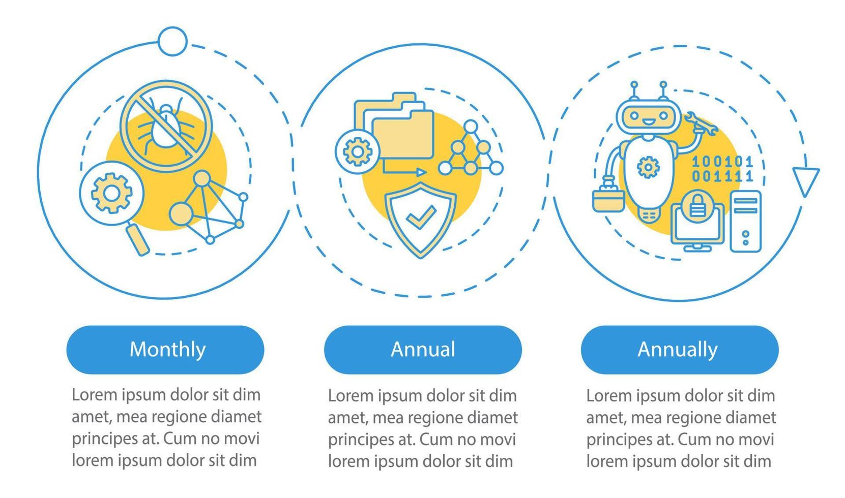 Antivirus subscription vector infographic template. Anti virus software tariff plans. Data visualization with three steps and options. Process timeline chart. Workflow layout with icons Pro Vector