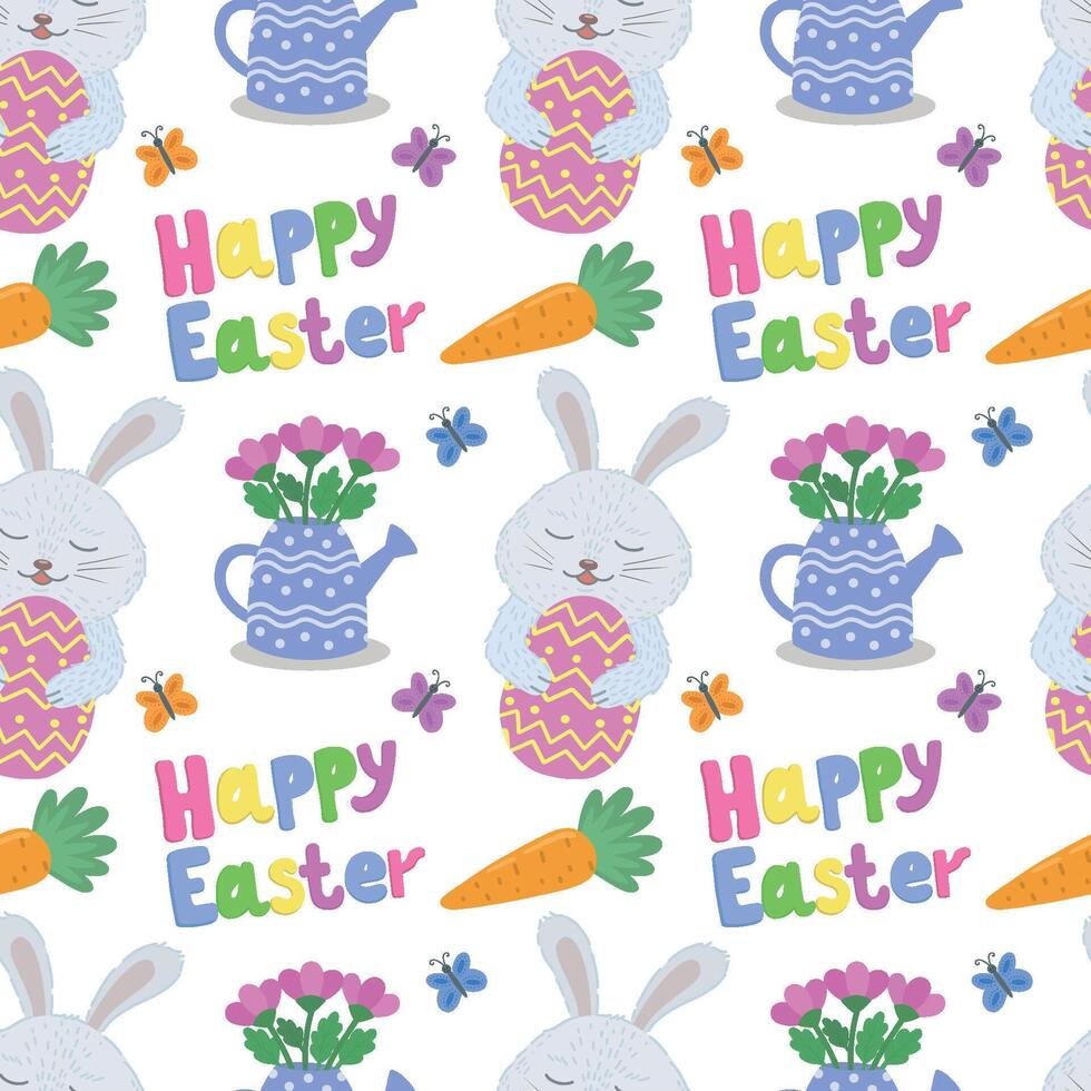 Seamless pattern with flowers, eggs and rabbits for Easter, vector illustration. Easter vector pattern with rabbit, butterfly, eggs. Pro Vector