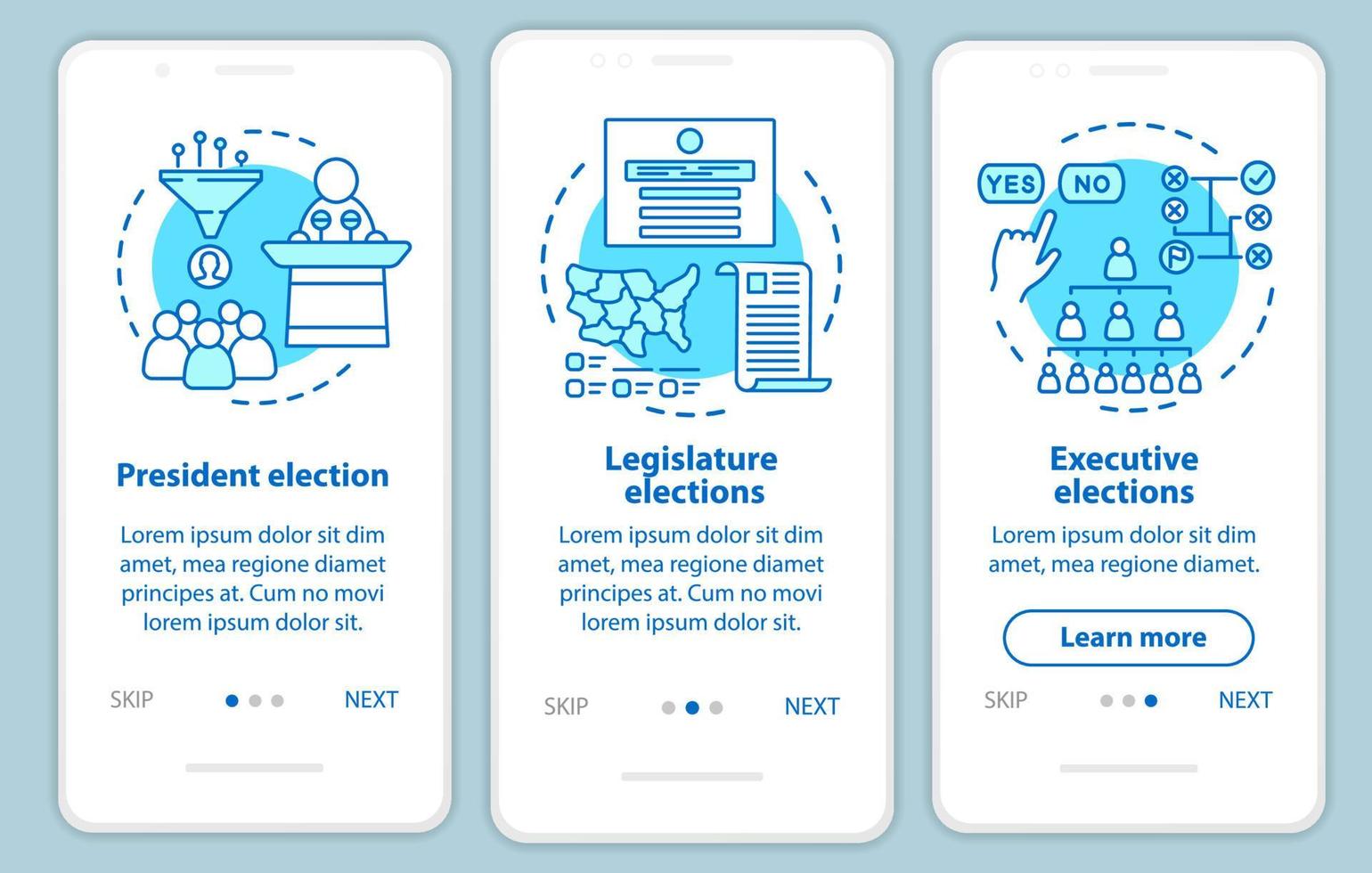 Elections onboarding mobile app page screen with linear concepts. President, legislature, executive elections. Three walkthrough graphic instructions. UX, UI, GUI vector template with illustrations Pro Vector and Pro SVG