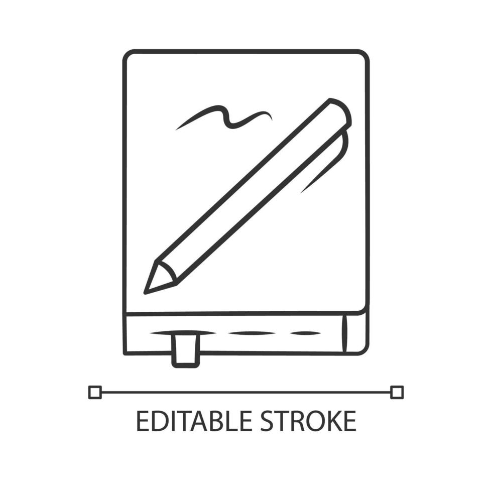 Notebook with pen linear icon. Notepad, diary, stationary item. Taking notes, to do list organizer. Sketchpad. Thin line illustration. Contour symbol. Vector isolated outline drawing. Editable stroke Pro Vector