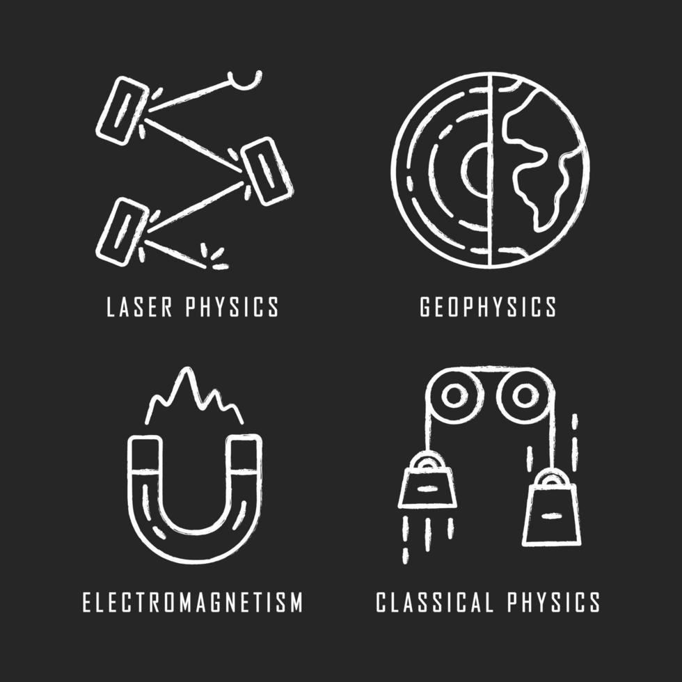 Physics branches chalk icons set. Laser and classical physics, electromagnetism and geophysics. Physical processes and phenomenons. Scientific experiment. Isolated vector chalkboard illustrations Pro Vector