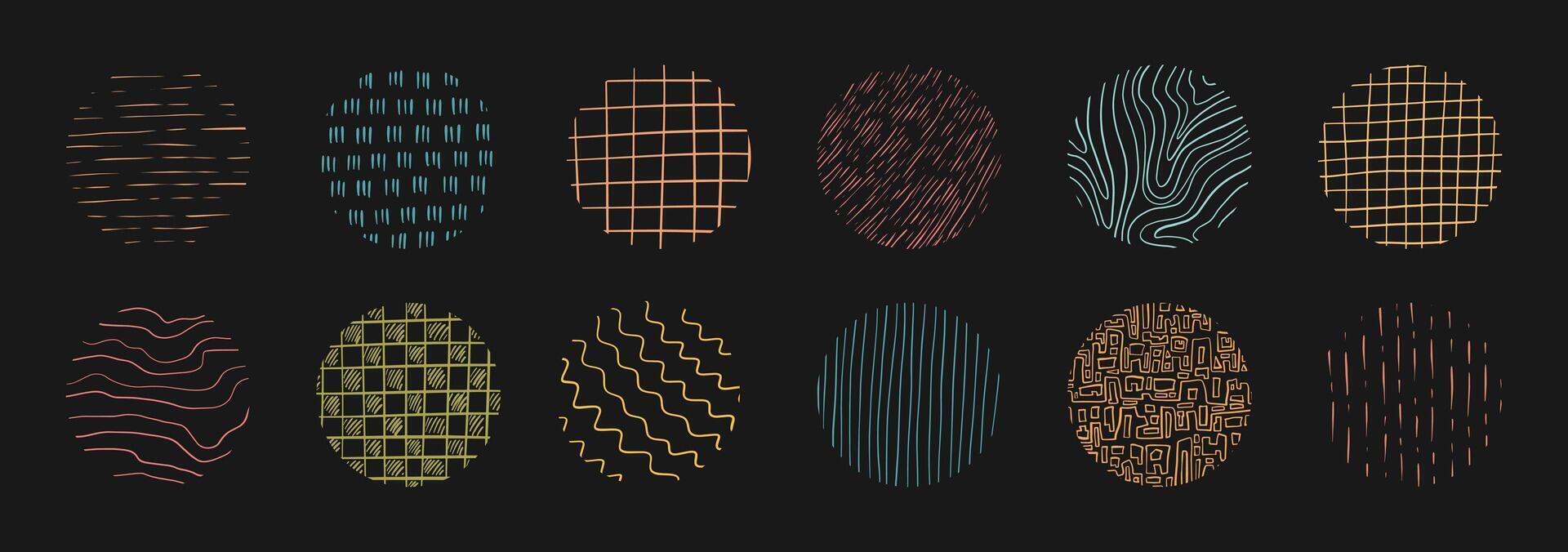 Set of hand drawn texture with different pencil patterns. Crosshatch, rain, wood, wave and lines. Vector illustration on black background Pro Vector