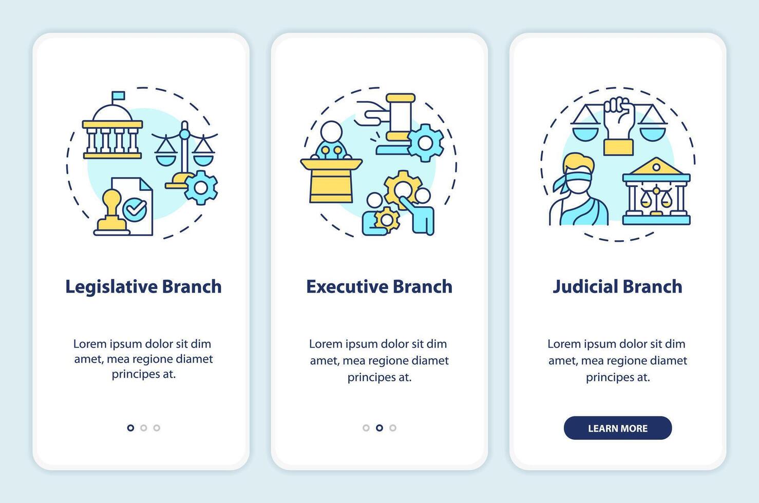 Branches of government onboarding mobile app screen. Walkthrough 3 steps editable graphic instructions with linear concepts. UI, UX, GUI template Pro Vector