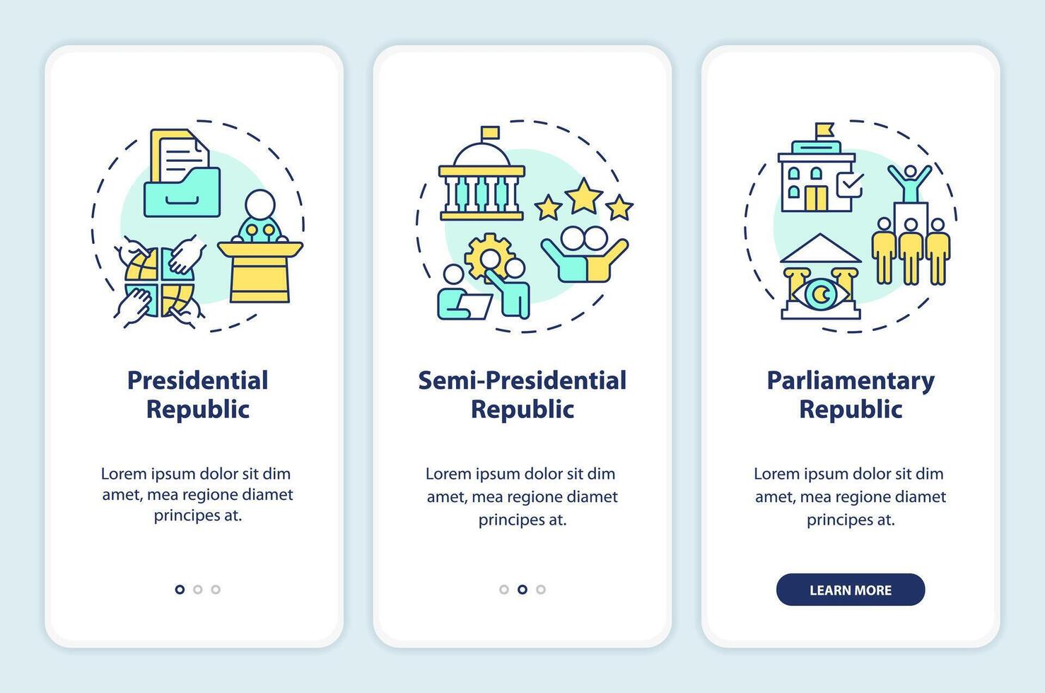 Government structure onboarding mobile app screen. Political system. Walkthrough 3 steps editable graphic instructions with linear concepts. UI, UX, GUI template Pro Vector