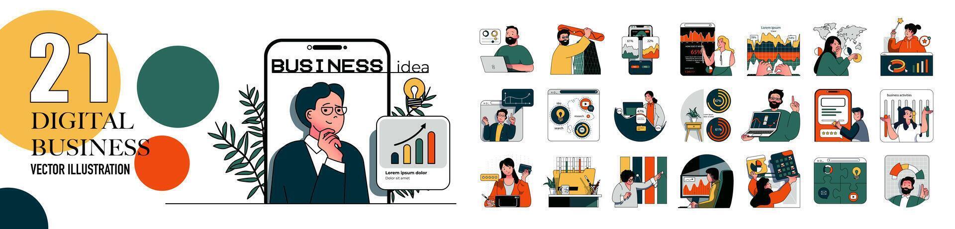 Digital business concept with character situations collection. Bundle of scenes people making data analysis, creating online company, developing, advertising. Vector illustrations in flat web design Pro Vector