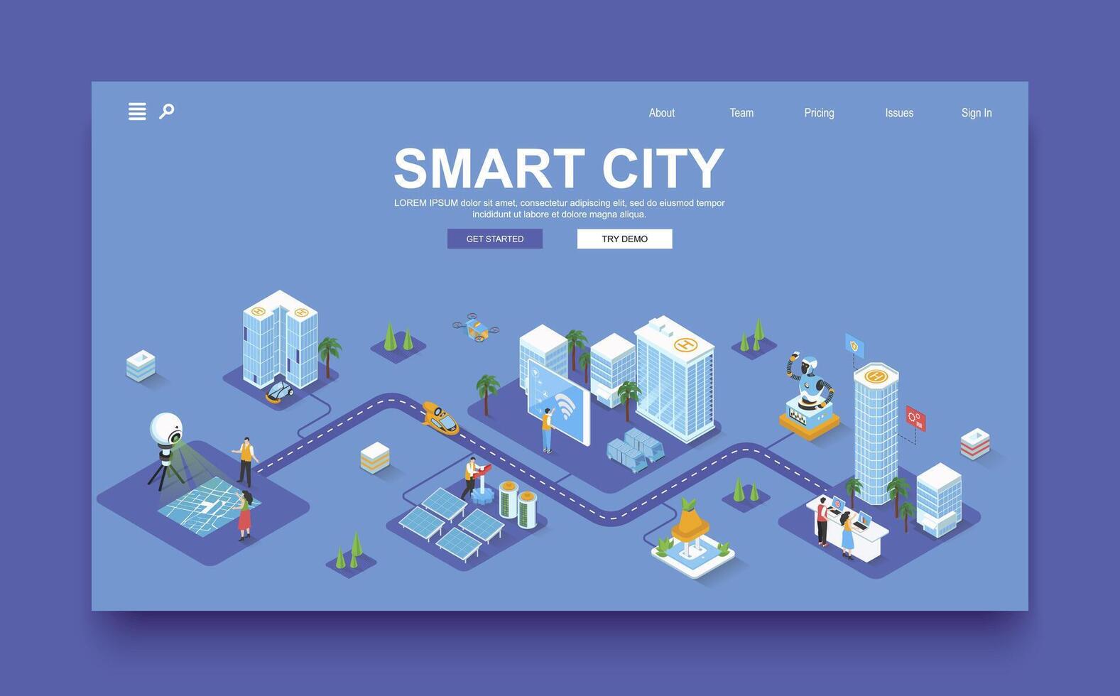 Smart city concept 3d isometric landing page template. People live in skyscrapers with smart automation system and futuristic infrastructure. Vector illustration in isometry graphic design. Pro Vector