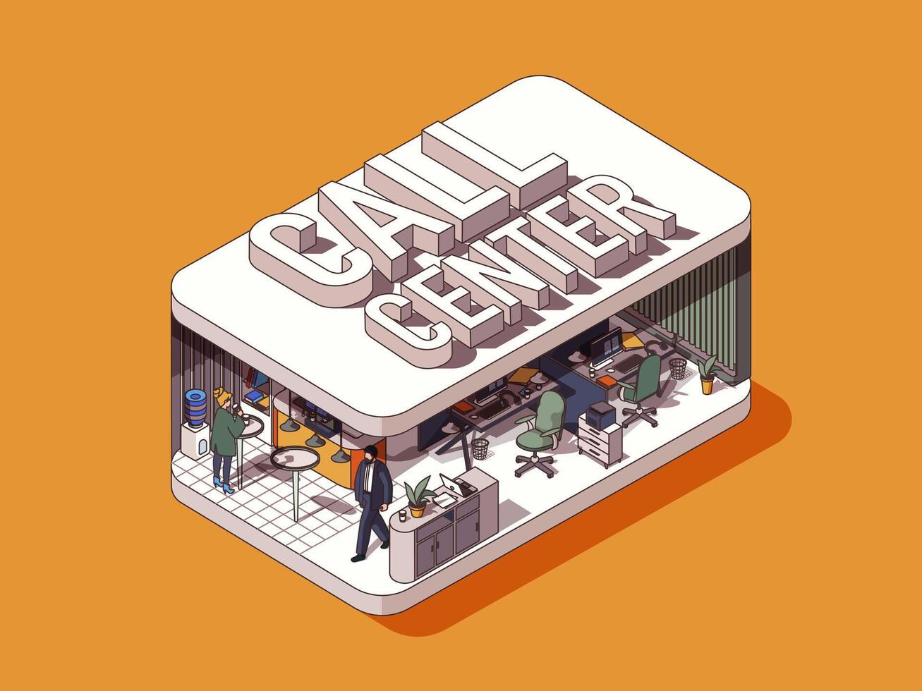 Call center concept in 3d isometric graphic design. Consulting clients and solving problems, technical support work in office. Vector illustration with people in isometric room interior for web banner Pro Vector