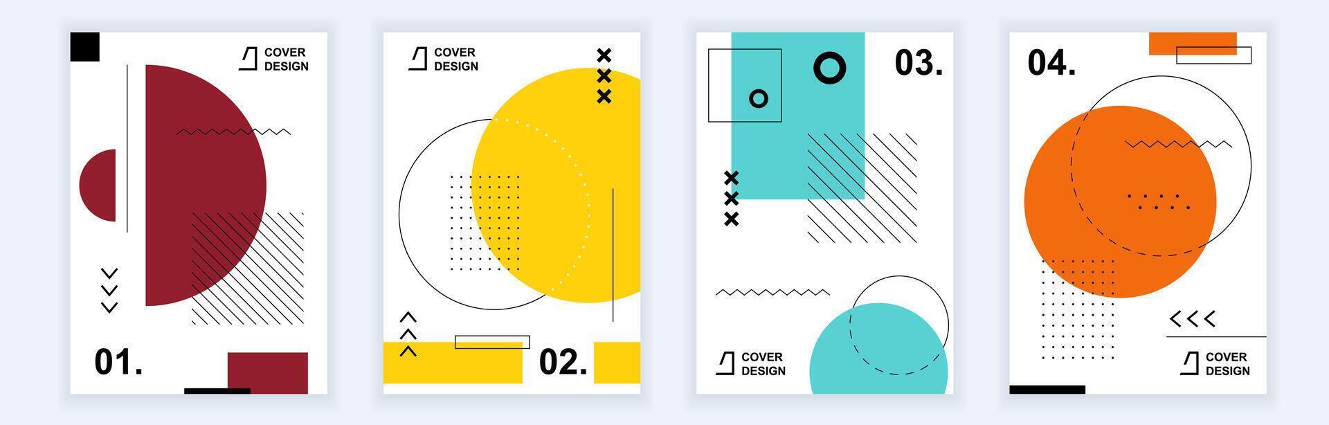 Abstract brochure covers set in modern minimal geometric design. Memphis style background templates with graphic geometry elements composition in A4 format for brand book identity. Vector illustration Pro Vector