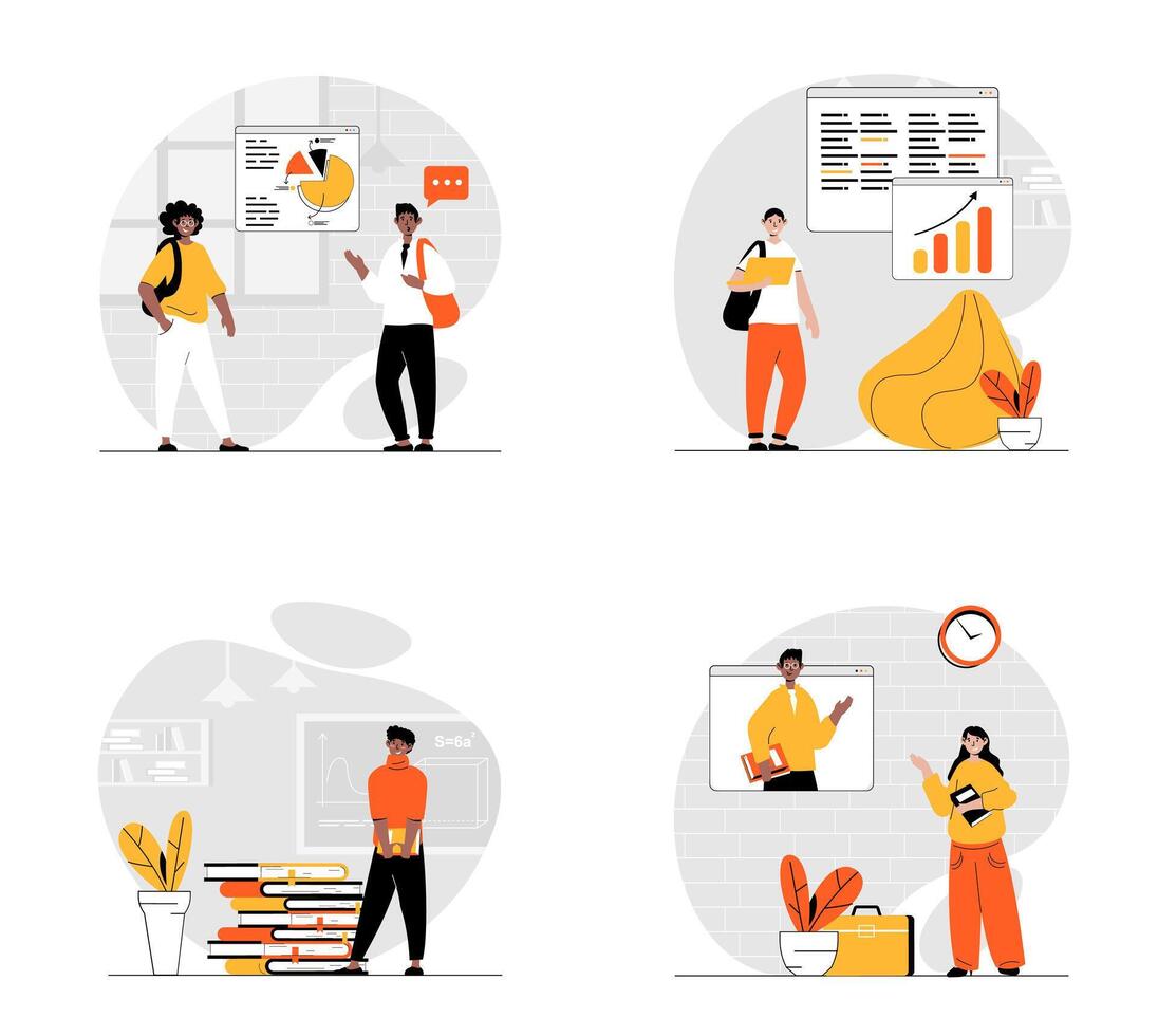 Education and learning concept with character set. Collection of scenes people studying at lessons and webinars, discussing report presentation, reading books. Vector illustrations in flat web design Pro Vector